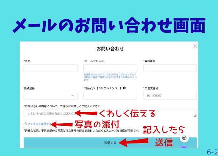 | 不具合の状況 | 「画面が映らない」「充電が〇%で止まる」など、メモしておくとスムーズ。 |