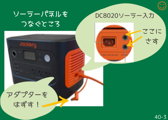 ソーラーパネルのケーブルは、キャップをはずす(DC‐8020にする)こと。これだけです!