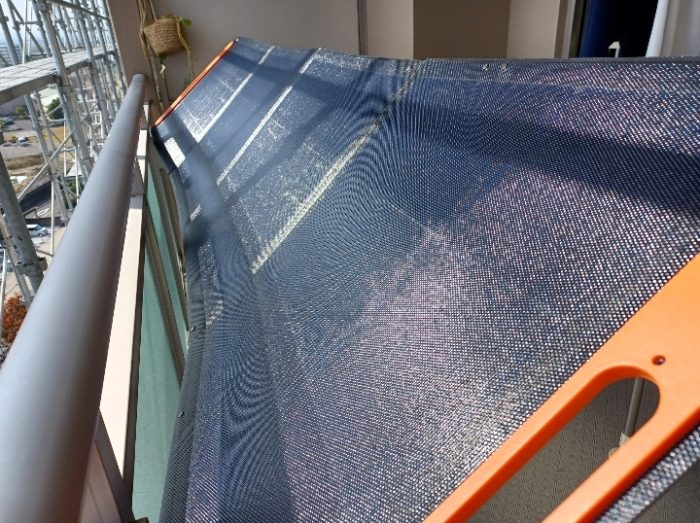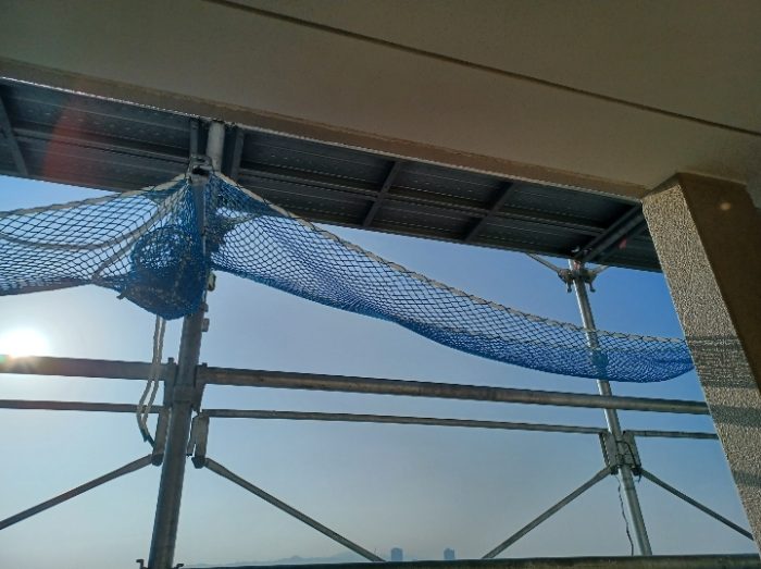 工事の足場とメッシュカバーがあるベランダで、